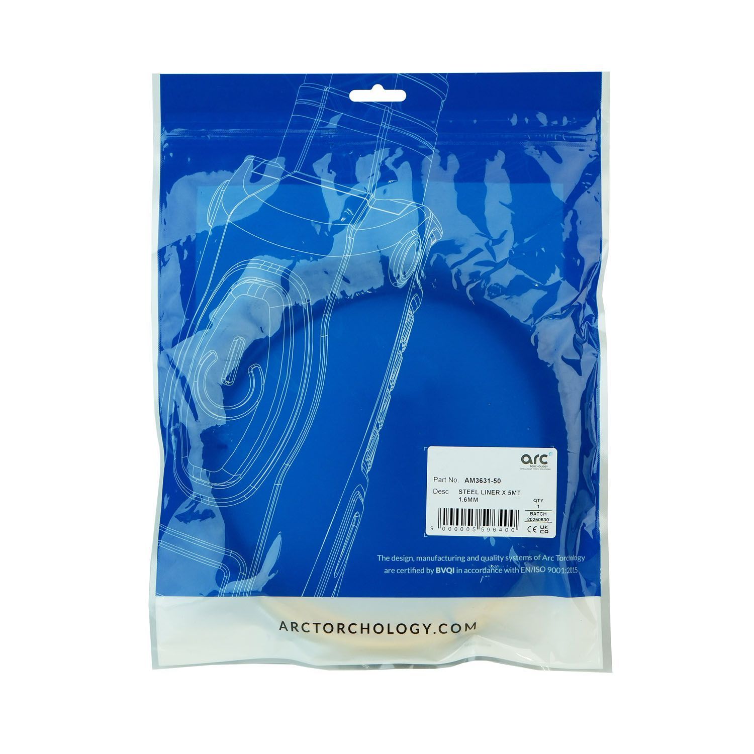 Направляющий канал Arc AM3631-50 предназначен для подачи углеродистой и низколегированной сварочной проволоки (проволочного электрода) диаметром 1,6 мм от подающего механизма полуавтомата в зону сварки. Направляющий канал состоит из стальной спирали длиной 5 метров, оплётки красного цвета и пластикового ниппеля. Также на ниппеле канала предусмотрены дополнительные уплотнительные кольца во избежание потерь защитного газа. Подходит для полуавтоматических MIG/MAG горелок Arc M4W.