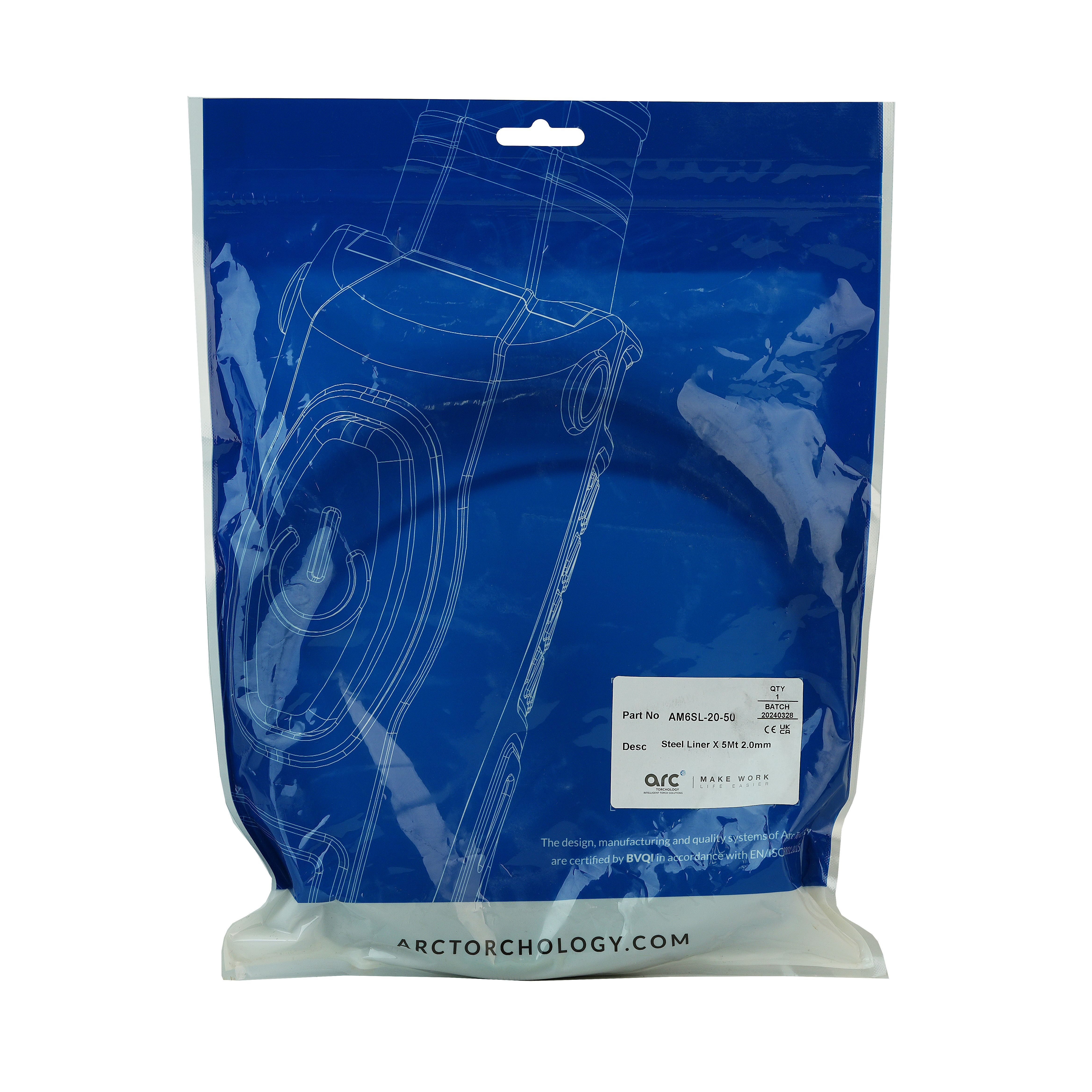 Направляющий канал Arc AM6SL-20-50 предназначен для подачи углеродистой и низколегированной сварочной проволоки (проволочного электрода) диаметром 2,0 мм от подающего механизма полуавтомата в зону сварки. Направляющий канал состоит из стальной спирали длиной 5 метров, оплётки зелёного цвета и пластикового ниппеля. Также на ниппеле канала предусмотрены дополнительные уплотнительные кольца во избежание потерь защитного газа. Подходит для полуавтоматических MIG/MAG горелок Arc M5 / M6 / M5W / M55W / M5WM / M55WM / M65W.