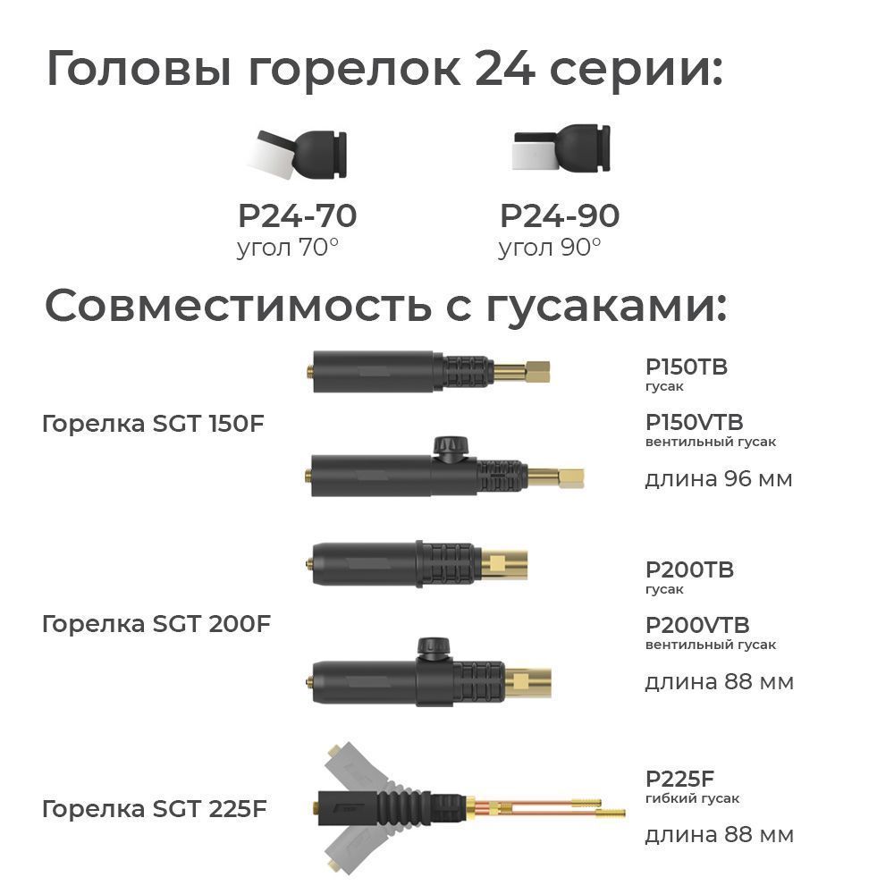 На голове закрепляются все расходные части: колпачок, изолятор, цанга, цангодержатель, газовая линза, керамическое сопло. Серии расходных частей аналогичны сериям для горелки SGT 24W: стандартная, с газовой линзой, с короткой газовой линзой.