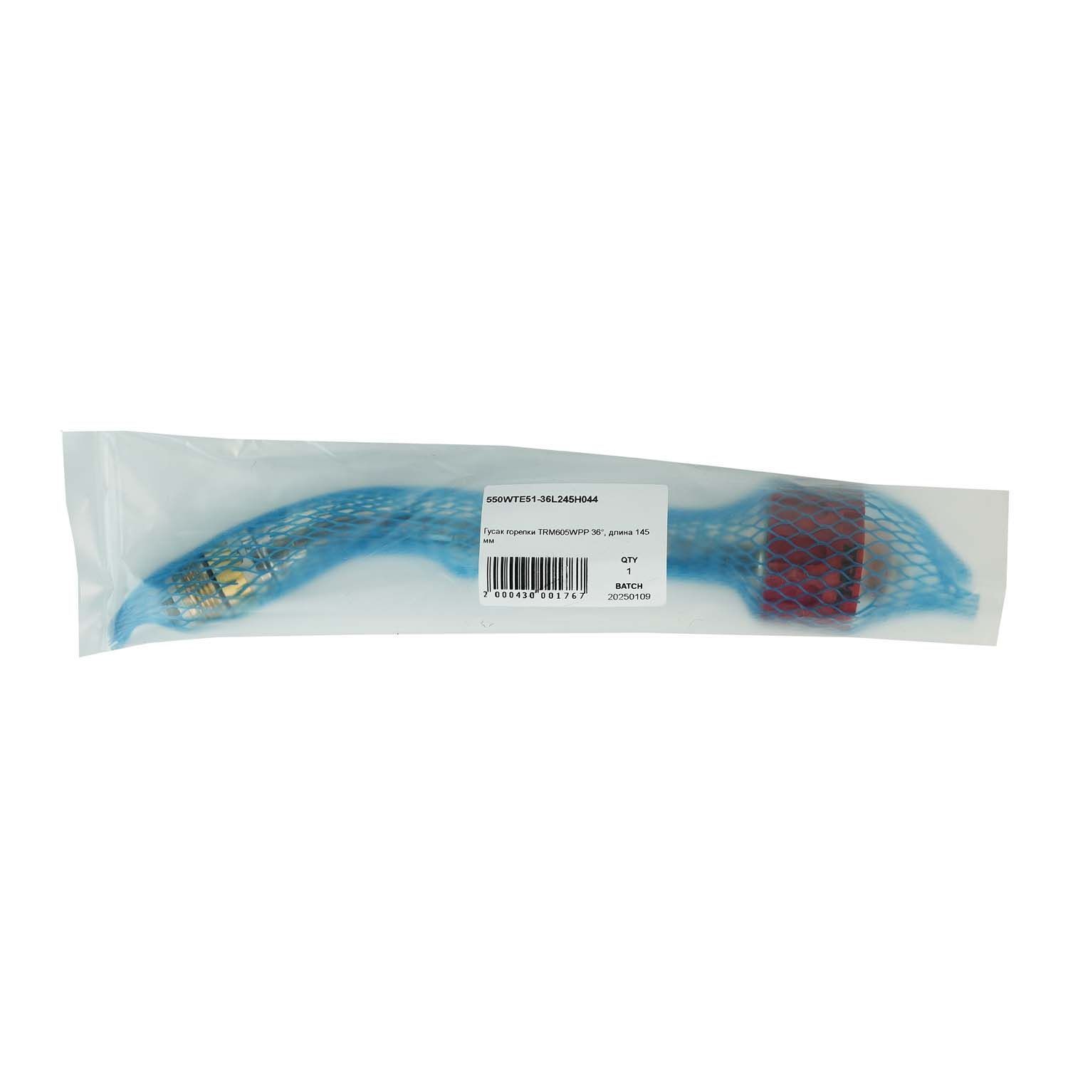 Гусак TRM 550WTE51-36L245H044 для роботизированных горелок с жидкостным охлаждением TRM605WPP / TRM605WHD. Служит для подачи в зону сварки защитного газа, сварочной проволоки и тока. На гусаке закрепляются все расходные части: сопло, вставка под наконечник и контактный наконечник. Длина гусака составляет 24,5 см (длина прямолинейного участка 14,5 см). Гусак изогнут на 36° для обеспечения лёгкого прохождения проволоки (например, мягкой или большого диаметра).