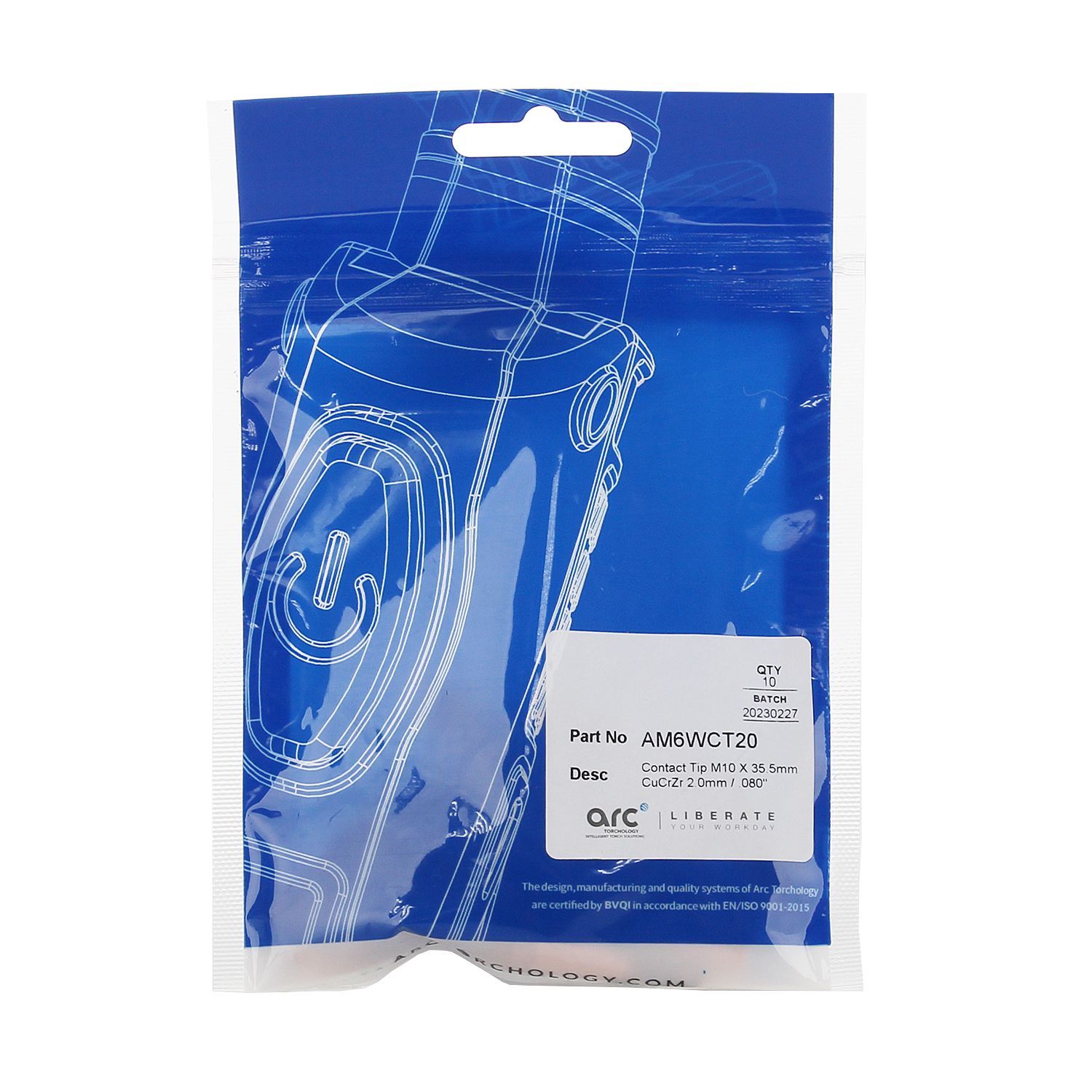 Контактный наконечник Arc AM6WCT20 для полуавтоматических MIG/MAG горелок Arc M5 / M55W / M55WM / M6W / M65W / M65WA. Сварочный наконечник длиной 35,5 мм имеет посадочную резьбу М10x1,5. Изготовлен из сплава CuCrZr и предназначен для подачи в зону сварки сплошной или порошковой проволоки диаметром 2,0 мм. Рекомендуется для стальных углеродистых и низколегированных видов проволок. Устанавливается во вставку под наконечник (держатель наконечника) с соответствующей резьбой.