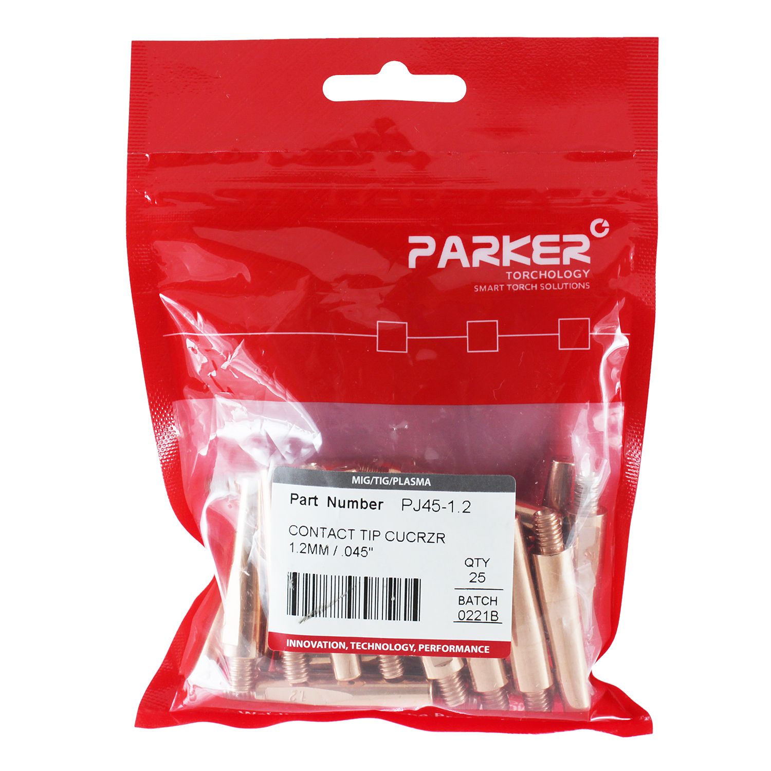 Контактный наконечник Parker PJ45/1.2 для полуавтоматических MIG/MAG горелок серии Suregrip PN (аналог Panasonic): PN 200A / 350A / 500A. Изготовлен из сплава CuCrZr, имеет длину 45,0 мм, посадочную резьбу М6x1,0 и предназначен для подачи в зону сварки сплошной или порошковой проволоки диаметром 1,2 мм. Сварочный наконечник устанавливается во вставку под наконечник (держатель наконечника) с соответствующей резьбой. На корпус нанесён диаметр отверстия для лёгкой идентификации.