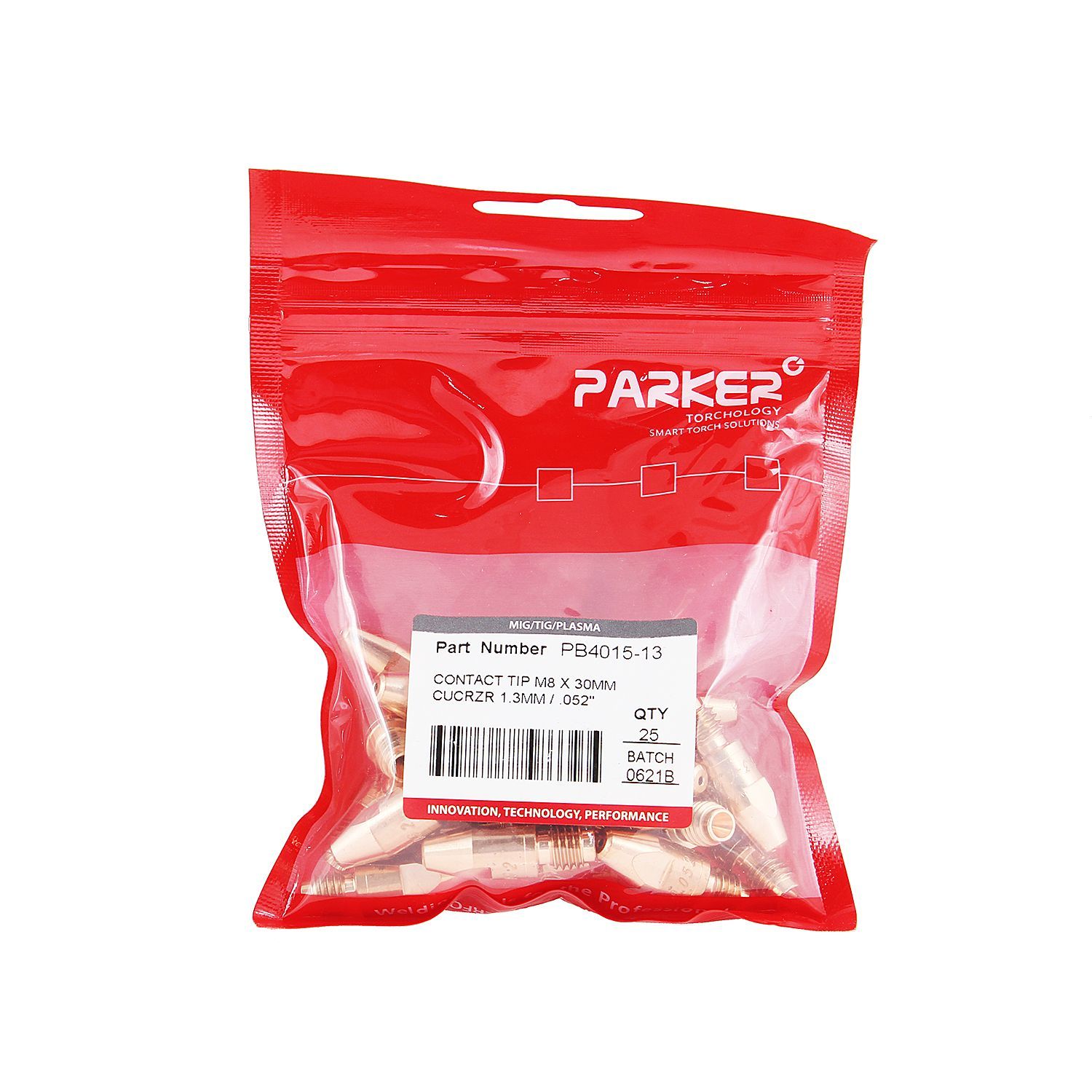 Контактный наконечник Parker PB4015-13 для автоматических и полуавтоматических MIG/MAG горелок. Изготовлен из сплава CuCrZr, имеет длину 30,0 мм, посадочную резьбу М8x1,25 и предназначен для подачи в зону сварки сплошной или порошковой проволоки диаметром 1,3 мм. Рекомендуется для стальных углеродистых и низколегированных видов проволок. Сварочный наконечник устанавливается во вставку под наконечник (держатель наконечника) с соответствующей резьбой. На корпус нанесён диаметр отверстия для лёгкой идентификации.