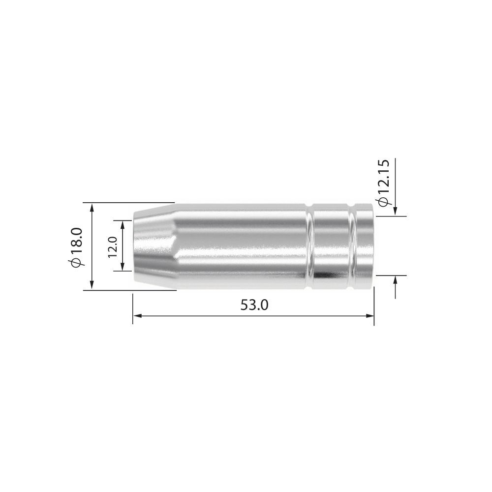 Сопло Parker PB1530 коническое медное с хромированным покрытием для MIG (полуавтоматических) горелок Parker SGB 150A / SGF 150A / STH 150AE, Abicor Binzel MB EVO 15 / MB EVO PRO 15. Сопло направляет поток защитного газа в зону сварки. Имеет диаметр выходного отверстия 12,0 мм, длину 53,0 мм и толщину стенки 0,9 мм. Газовое сопло устанавливается на гусак сварочной горелки без резьбы.