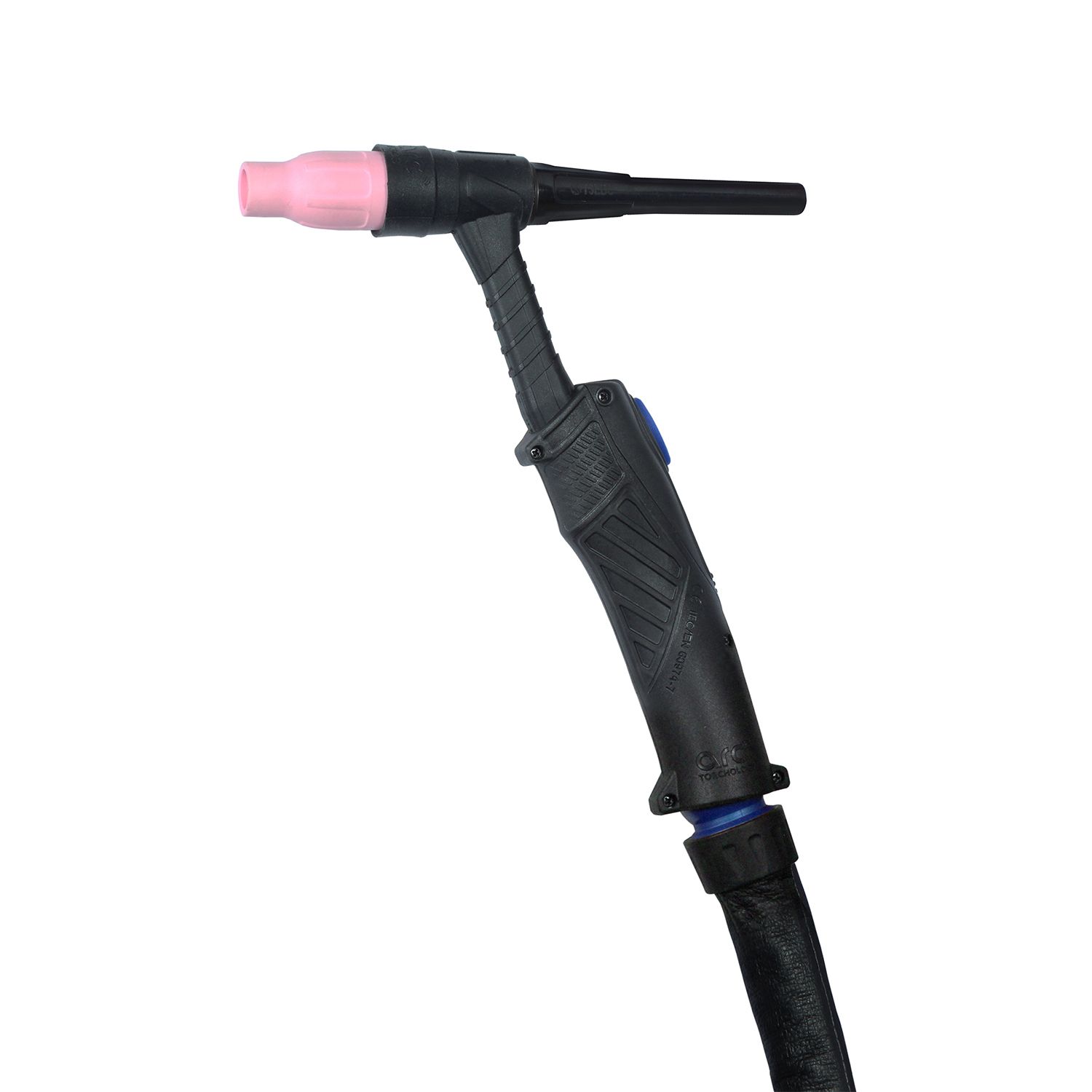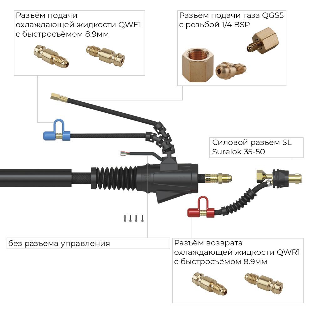Сварочная горелка Arc T5W с системой быстрой смены разъёмов для разных аппаратов (One TIG), длиной шлангового пакета 12 метров, модулем управления с 1 кнопкой, стандартным силовым разъёмом 35-50, разъёмом подачи газа с резьбой 1/4" BSP и разъёмами подачи и возврата охлаждающей жидкости с быстросъёмом 8,9 мм.