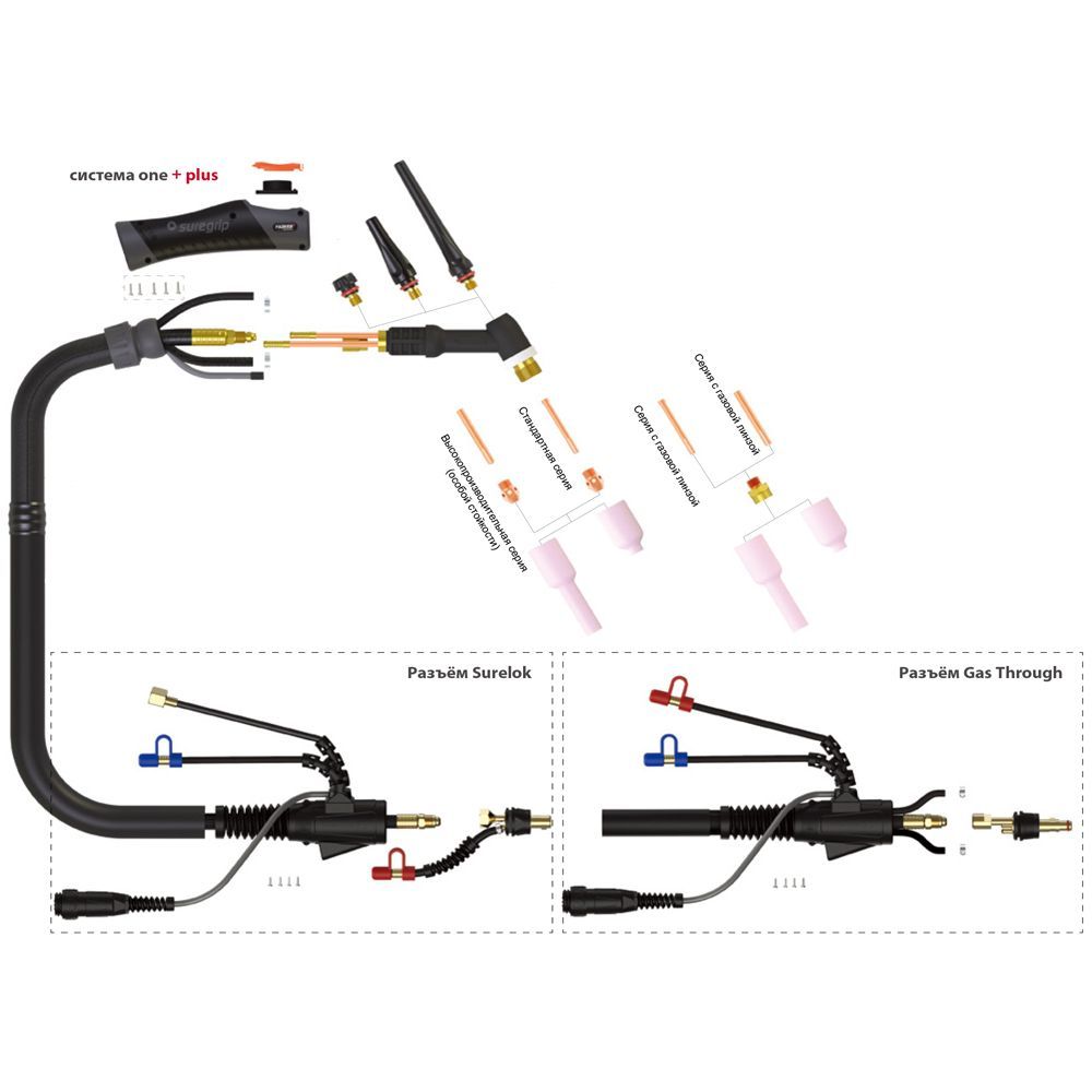 Все расходные части произведены по чертежам на высококачественном оборудовании, что гарантирует надёжность, долговечность и превосходный результат. Каждая деталь продумана для удобства работы во всех пространственных положениях. В стандартной комплектации горелка оснащена длинным колпачком, модулем управления с 1 кнопкой моментального переключения и силовым разъёмом SurelokTM 35-50 (типа Dinse).