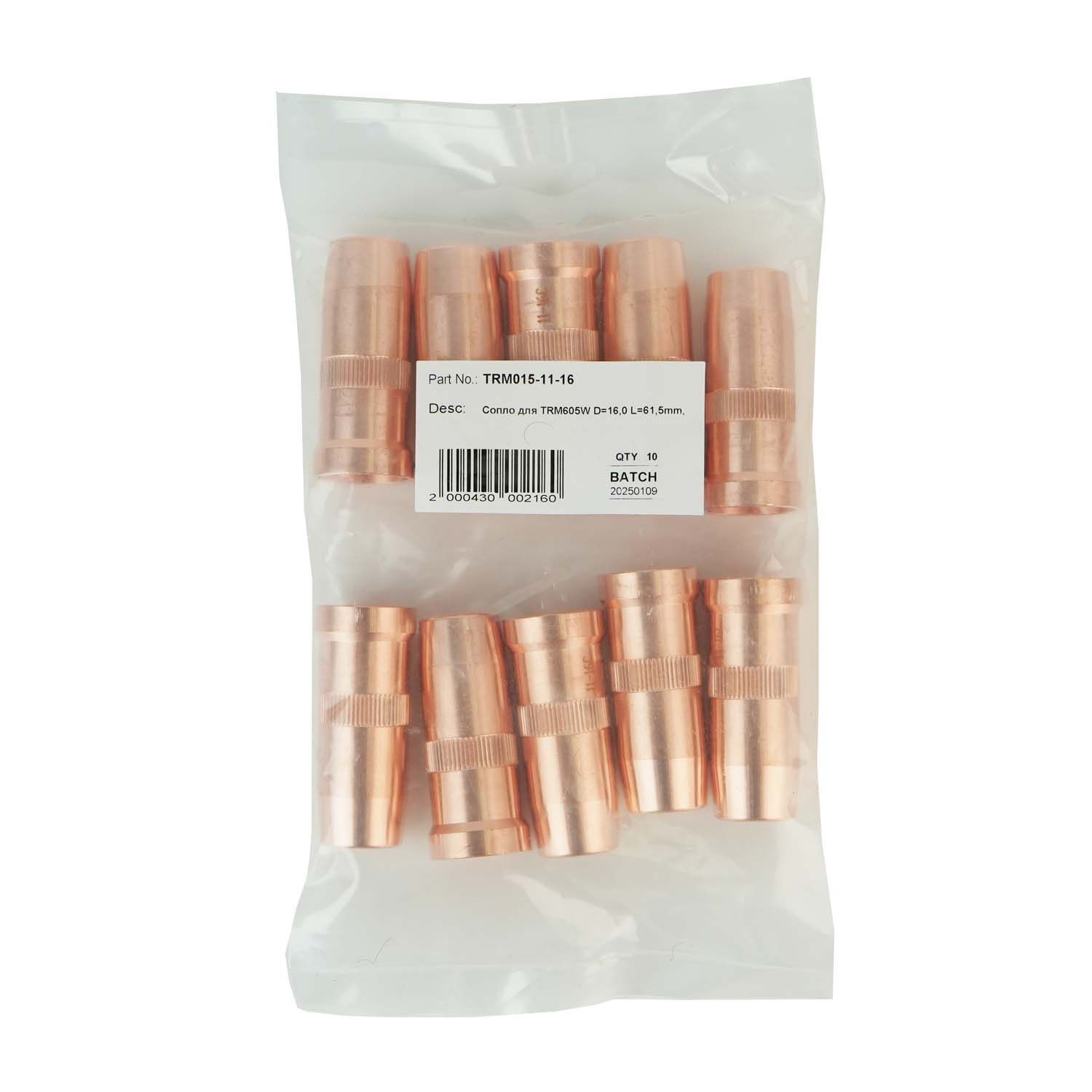 Сопло TRM015-11-16 для роботизированной горелки с жидкостным охлаждением TRM605W. Сопло направляет поток защитного газа в зону сварки. Имеет диаметр выходного отверстия 16,0 мм и длину 61,5 мм. Газовое сопло устанавливается на гусак сварочной горелки.