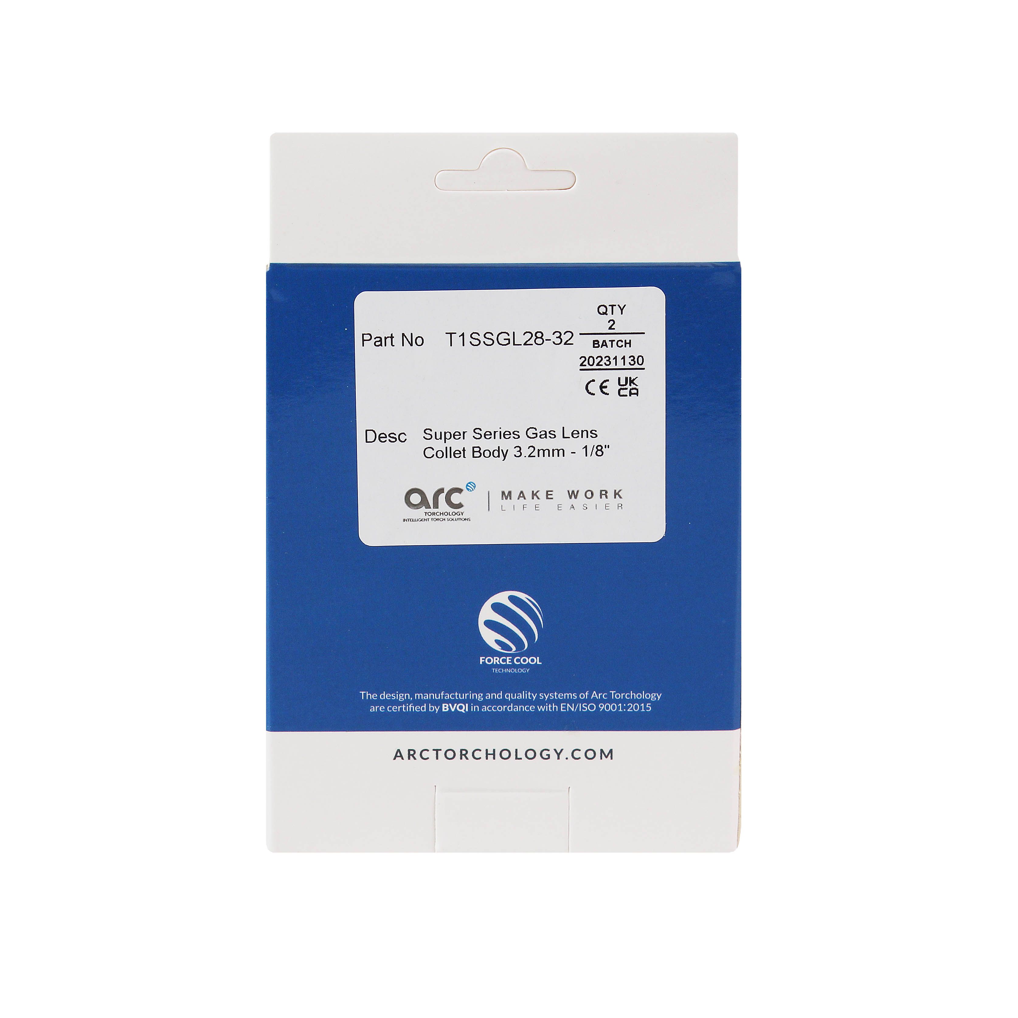 Цанга с газовой линзой Arc T1SSGL28-32 Супер Серии (Super Series) для аргонодуговых TIG горелок Arc T1 / T1W / T1WLT. Имеет длину 64,3 мм и предназначена для надёжного закрепления вольфрамового электрода диаметром 3,2 мм и подачи на него сварочного тока. Диаметр газовой линзы составляет 27,4 мм, что соответствует серии расходный частей Супер Серии D28.