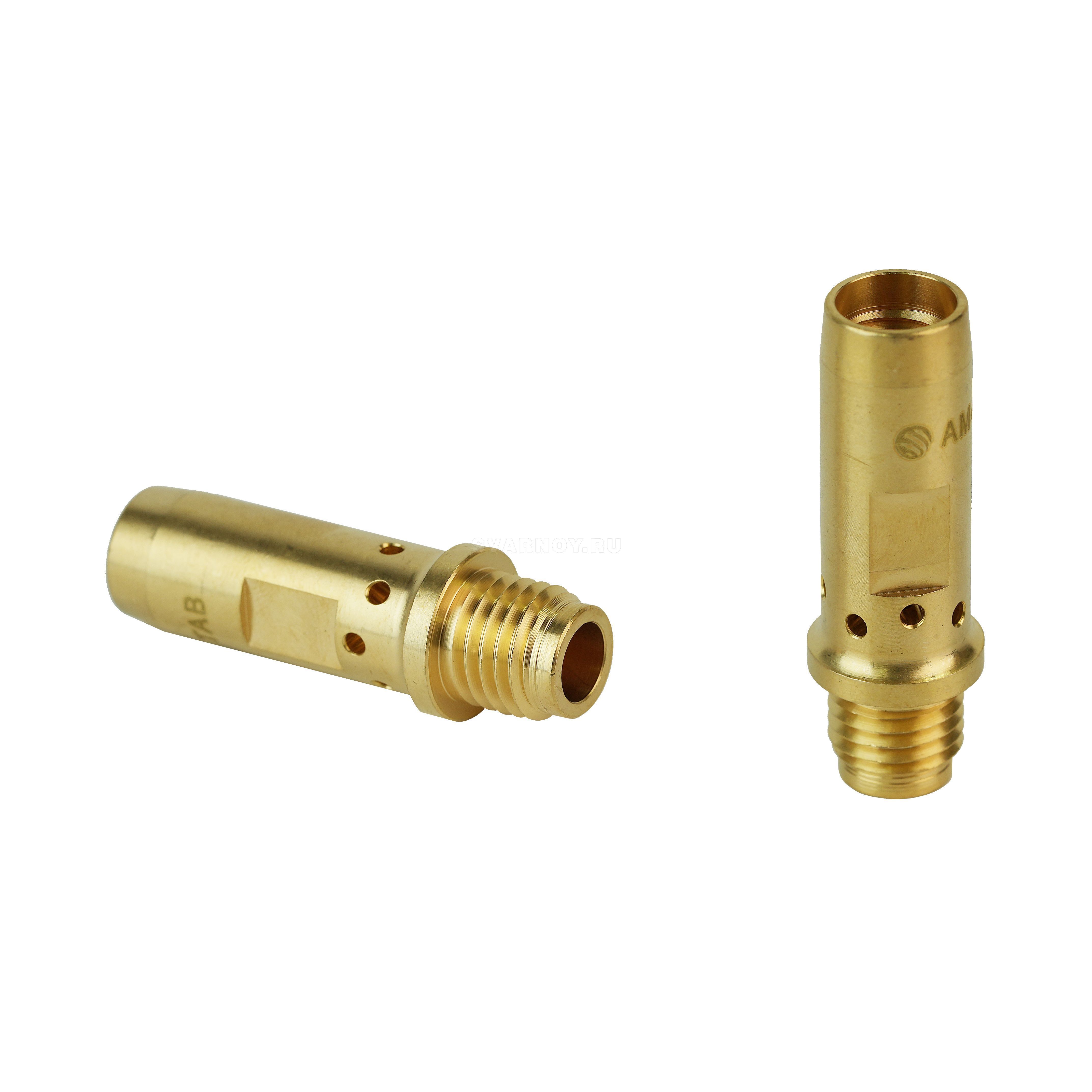Вставка под наконечник Arc AM4TAB для полуавтоматической MIG/MAG горелки Arc M4. Держатель наконечника длиной 46,5 мм, с резьбой посадки М12x1,5 и с резьбой наконечника М10x1,5. Вставка изготовлена из латуни и предназначена для фиксации контактного наконечника и равномерного распределения потока защитного газа. Адаптер наконечника рекомендуется для сварки на высоких токах и в импульсном режиме на низких токах.